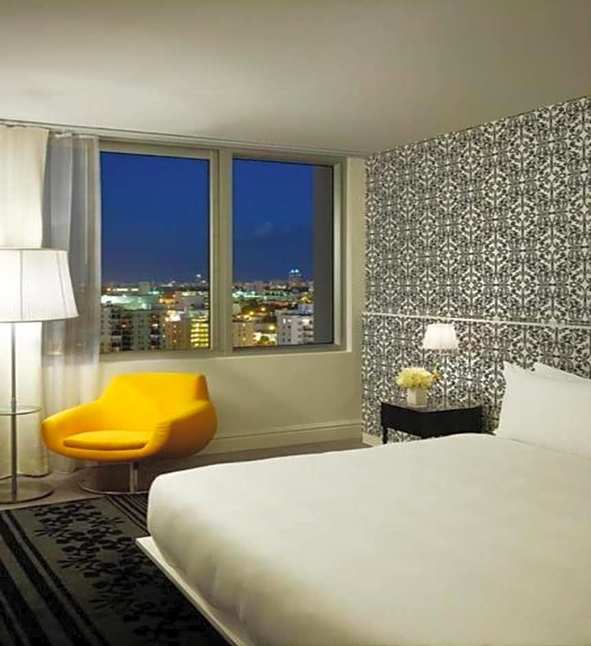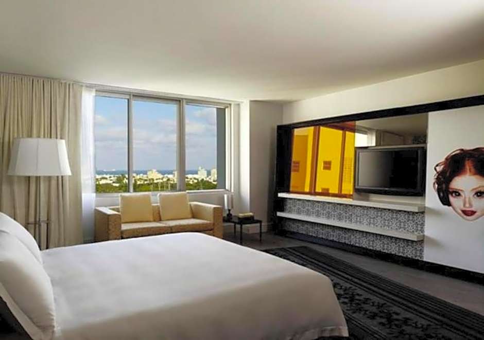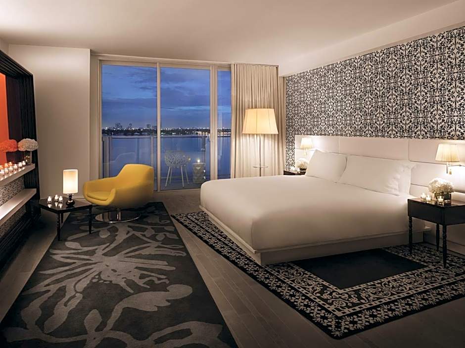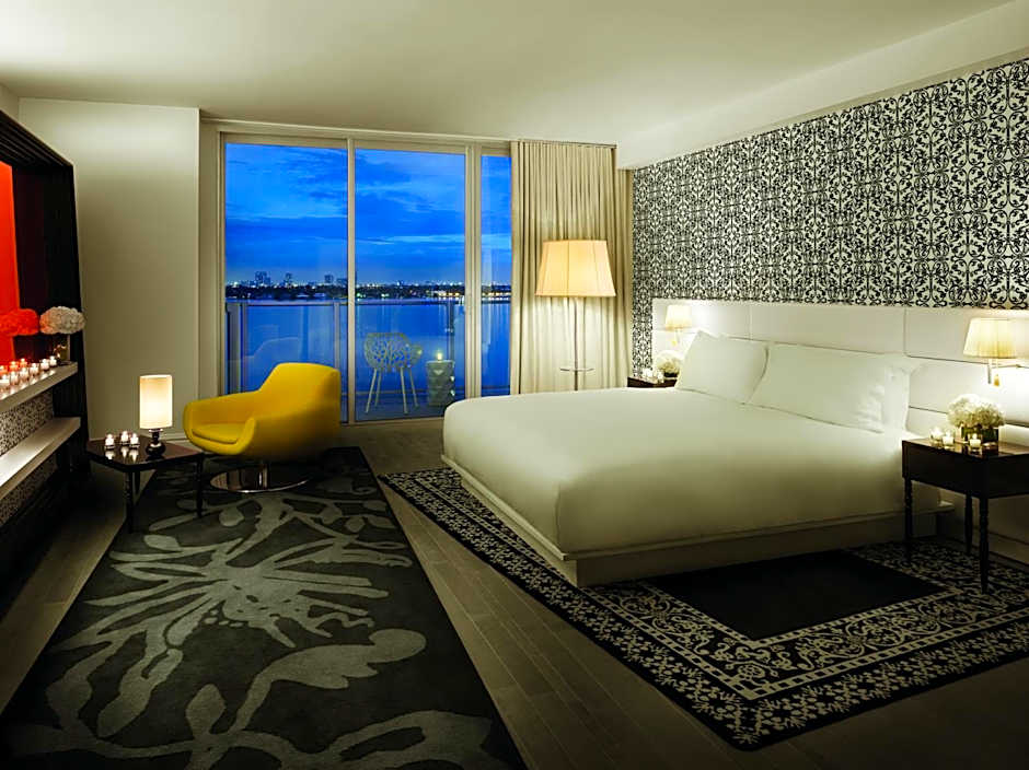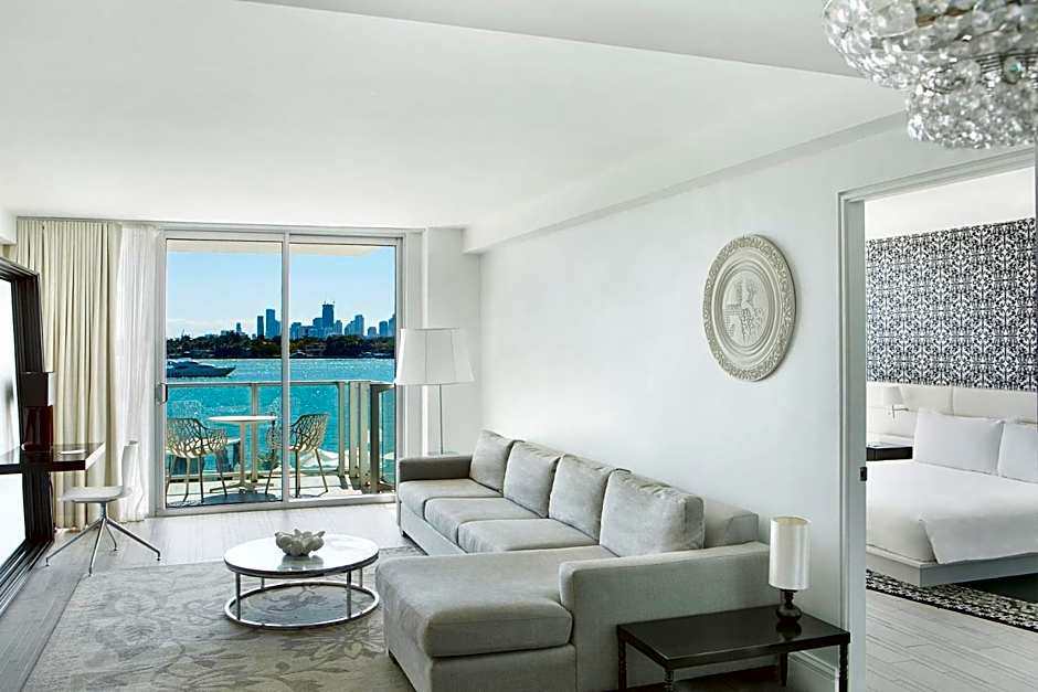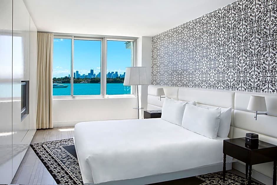 This studio features views of the Biscayne Bay and Miami skyline as well as a 42-inch flat-screen TV and kitchenette, complete with a small refrigerator, 2-burner stove, and microwave.