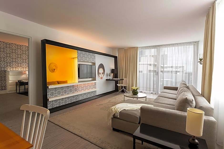 This 1-bedroom suite features a balcony,a kitchenette and a living room area with a sofa and flat-screen TV.